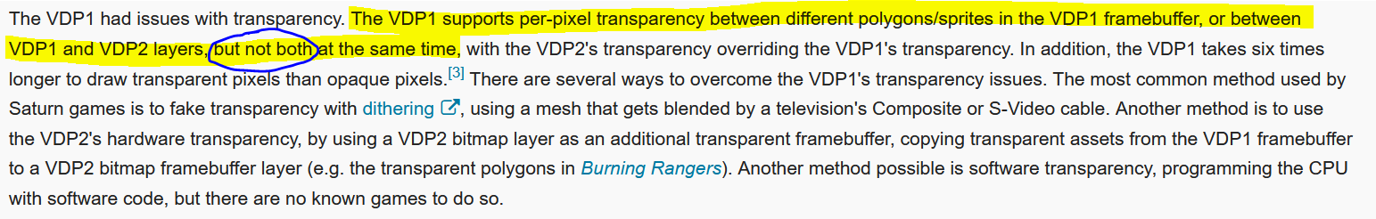 Conclusion : pour moi l’incompatibilité est avérée à cause des problèmes de priorité des couches qui sont empilées pour construire l’image. Utiliser la transparence du VDP1 c’est la croix et la bannière, et ça ne peut être vraiment joli qu’avec des sprites, à cause du fait que les mêmes pixels sont ré-écrits plusieurs fois sur les polygones.